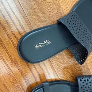 Keywords: Michael Kors, Sandals, Slides, Toe Ring, Black, Leather, Cutout, Designer, Casual, Summer Shoes, Comfortable, MK Logo, Womens Shoes