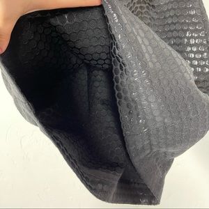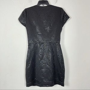 2B Rych womens size 6 solid black knit midi pouf style dress. Polka dot print. Cap sleeves. Zipper details. Rounded scoop neckline. Pleated front details. Lightweight stretchy fabric. Unlined. Gently worn with no flaws. Zip side.