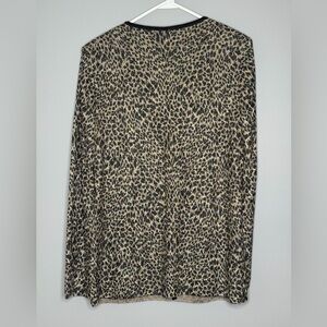 Excellent like new pre-owned condition with no issues or flaws. Leopard design through St John’s classic knitwear. Metallic thread woven throughout and black knit trim. Slightly oversized, could fit a large. See measurements.