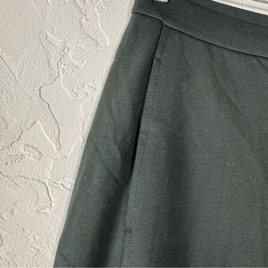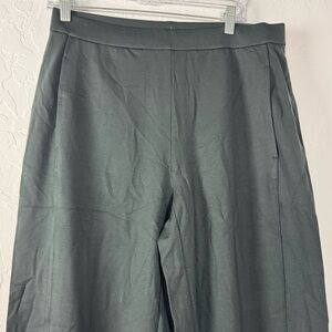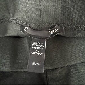 Eileen Fisher womens size medium washable flex ponte style dress pants trousers in a solid black color. Wide leg style. High waisted rise. Elastic pull on style waist. Unlined. Side pockets. Seam down front. Textured ponte knit fabric with stretch in tencel blend. Perfect for career use, office, or work wear. New without the tags, never worn. Only flaw is a covered brand tag. No others.