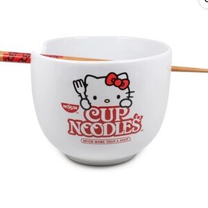 White Hello Kitty Cup Noodles bowl with red and black design. Enjoy your favorite noodles or soup in style! This officially licensed Hello Kitty ramen bowl is made of rugged, BPA-Free ceramic that holds heat well. The included chopsticks, along with the built-in holder make it a complete meal set. Great for daily usage or to put on display for all to see. Trendsetting Dishware: Slurp down some yummy noodles with Hello Kitty to keep you company. Inspired by traditional Japanese dining, this charming ramen set is a must-have for any home kitchen collection.