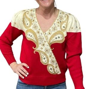 Beautiful red and gold Jaclyn Smith v neck sweater, size medium. Pit to pit measures 19” and length measures 22.5”