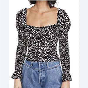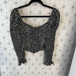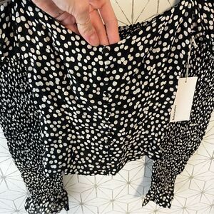 Adorable faux button front. Puff shoulder with smocked sleeves until the cuffs have little ruffles. Smocked back with zip closure. Really cute neckline!