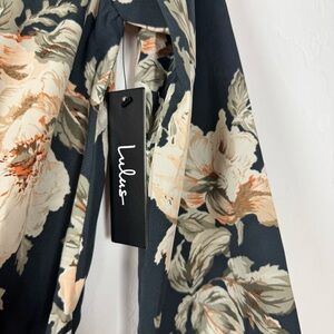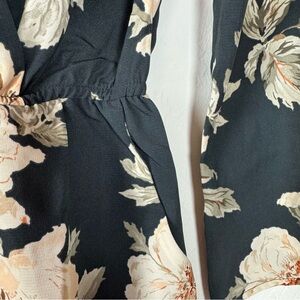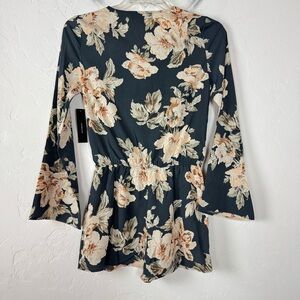 Lulus womens size small prairie daydream romper one piece onesie playsuit in a floral all over print. Washed dark navy blue with pink, white, green, details. Plunge v neckline with snap button for bust. Wrap crossover details. Elastic waist with pocket sides. Long bell flare sleeves. Unlined. 100% polyester fabric no stretch. Perfect to dress up or for casual use. New with the tags, no flaws.