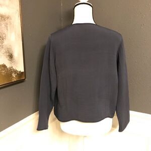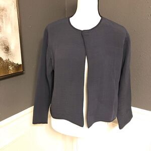 Crinkled textured fabric. Magnetic closure, just at the top of Jacket. This is missing the size tag but I am 5’4 and 140 and it fits just a little big and is a tad short since it’s a petite. I would estimate that this is a size 6P. Ask for measurements if interested!