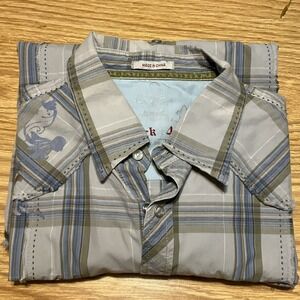 Wrangler Rock 47 Shirt Mens XL Black/Gray Plaid Western Pearl Snap W/Graphic