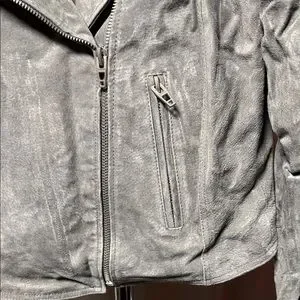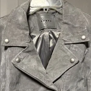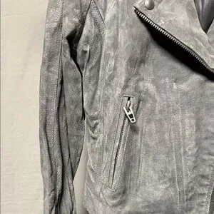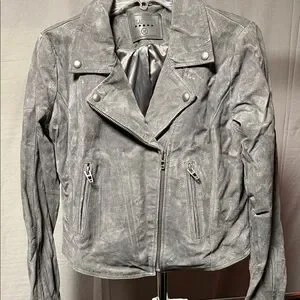 Chic ash gray leather jacket. Features a sleek biker style. Ideal for any season.