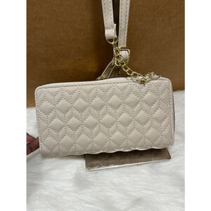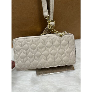 New with tags Color: Clay (beige) Gold tone hardware Removable and adjustable crossbody strap with chain accents Double zipper 12 card slots 1 zip compartment 4 slip pocket 4 cash/note compartments Soft quilted, beautifully stitched faux leather