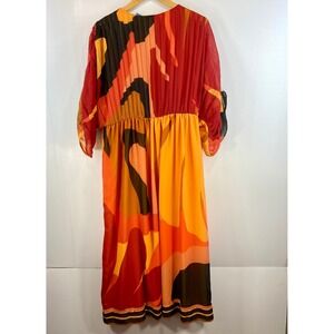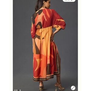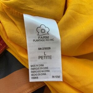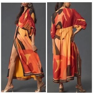 Farm Rio for Anthropologie Short Sleeve Wrap Front Maxi Dress Orange Brown Womens Large Petite. Style No. 278529. 100% Polyester. V neck; lined; elastic waist; pleated bodice; multi color - orange, yellow, brown. Excellent pre-owned condition.