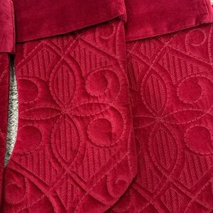 Elegant red velvet stockings with intricate quilted patterns. Perfect for holiday decor.