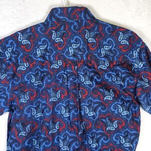 Keywords: Wrangler, George Strait, Cowboy Cut, Button Down Shirt, Paisley Shirt, Men's Shirt, Western Shirt, Casual Shirt, Blue Shirt, Red Shirt, Medium Shirt, Short Sleeve Shirt, Patterned Shirt