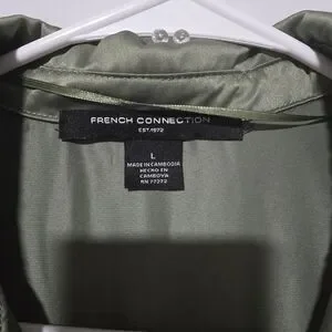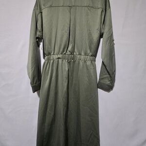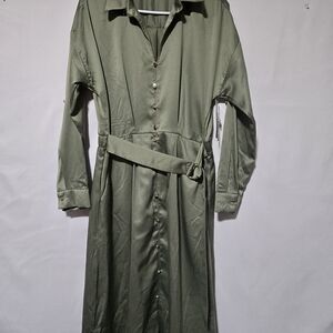 Elegant sage green dress with button front. Features long sleeves and a stylish belt. Belt is not removable. Ideal for any occasion.