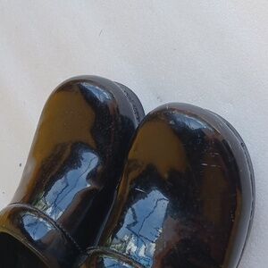 Stylish black patent leather clogs. Perfect for comfort and style for professionals on their feet.