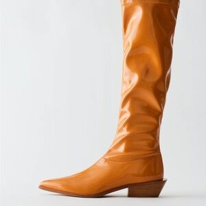 A high cut boot designed to step you through the Winter months and beyond, the Regular Patent Bronson Boot features a pointed toe and ultra-shiny polyamide fabric, creating that hard-to-define friction and a foundational component to achieving the good Ick. Equal parts chill, modern and classic, this ultra-versatile boot can be paired with midi skirts, dresses and even pants –adapting to your style aspirations, rooted in familiarity.