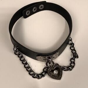 Stylish, cute, and eye-catching. This choker is made up of a vegan, non-leather strap, fastened with a heart and chains. Adjustable with three different snaps.