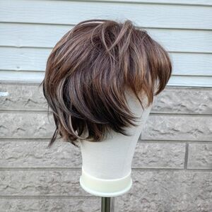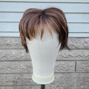 Stylish short wig with brown and tan highlights. Perfect for a chic look.