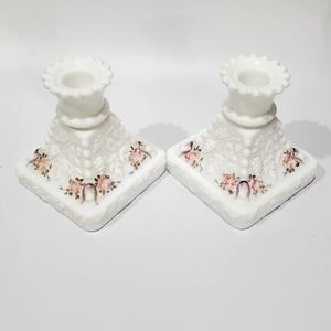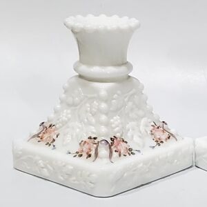 🎁2 Handpainted Paneled Grape White Milk Glass Beaded Single 1" Candlesticks