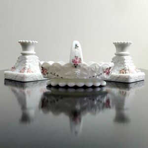 Gorgeous Crisp White Hand-painted with delicate Roses and Bows and adorn with fabulous beading. These beauties hold 1" Candles 🕯 and are in great condition absolutely NO chips-cracks. Shown with with the matching Basket, sold separately. Bundle both for a discount and save on shipping as all 3 pieces ship for the same price as 1 pieces.