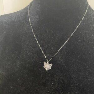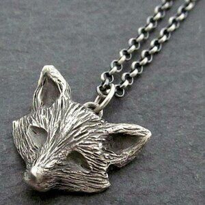 Hand sculpted and cast in sterling silver, this fox pendant measures approximately 14mm long and hangs on an 18-inch chain. This piece has been oxidized to bring out its details.