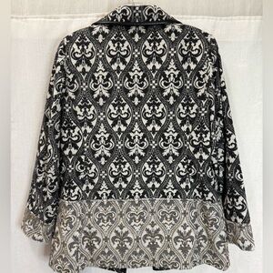 Elegant Chico’s New With Tags jacquard brocade blazer featuring a stunning black, white, and gold baroque pattern.