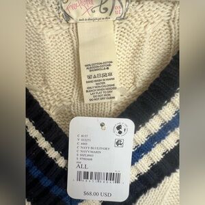 Features: V neckline, open sides; side ties, cable knit fabrication, ribbed striped collar and hem, hem rests below the waist