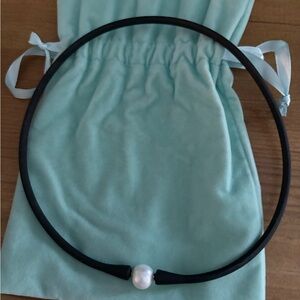 Chic black necklace with a lustrous white pearl centerpiece. Perfect for any occasion.