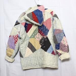 One-of-a-kind handmade upcycled quilt jacket by Hideaway Fashion Resale, created from a very old, hand-stitched vintage quilt. Exceptionally heavy, thick, and warm—this is a true cold-weather statement piece. Features bold patchwork, hooded design, and cozy quilted construction. Fabric is primarily cotton with possible cotton blends; exact content unknown due to vintage materials. Designed as an XL, but due to the weight and structure, it may also suit a Large depending on desired fit. Designed for warmth, texture, and character rather than perfection—each area tells a story.