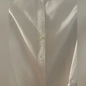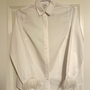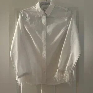 Elegant white button down shirt. Features feather trim on sleeves. Perfect for a chic look.