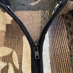 tapestry jacket, barn fly, boho jacket, artsy jacket, leaf print, patchwork jacket, cottagecore, bohemian, earthy tones, fall layering, zip front jacket, plus size boho, artisan style, casual chic, Grandpacore, teacher style