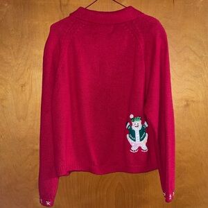 Cheerful red embroidered ugly Christmas sweater cardigan with snowman motifs. Ideal for festive occasions. Sequins and beads. Zips up.