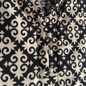 Dana Buchman chic sleeveless blouse with a geometric, black and cream pattern. V-Neck with pretty button detail.