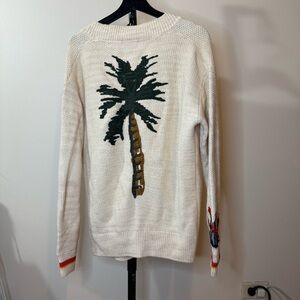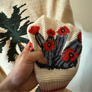 Chic cream cardigan with vibrant nature motifs. Features cactus and palm designs. Ideal for stylish layering.