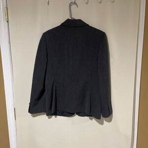 This women's AKA Eddie Bauer blazer, is a dark grey, single-breasted jacket with a subtle textured 100% wool shell and 100% polyester lining. two front flap pockets. Each cuff has three decorative buttons. A visible imperfection is a chipped main closure button. Otherwise it’s in excellent condition