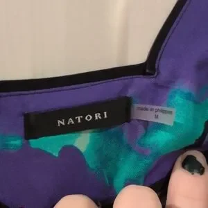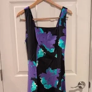 Chic dress by Natori. Features bold purple and teal floral pattern on a black base. Ideal for stylish outings. beautiful square neck