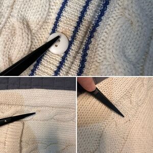 Vintage Quattro Quadrai for Crocodile 100% Wool Cardigan Sweater, size M. Features a classic cable-knit design, preppy blue trim, and front pockets. Perfect for retro academia, preppy, or varsity-inspired styles. Made from pure wool, this high-quality cardigan is cozy and timeless.