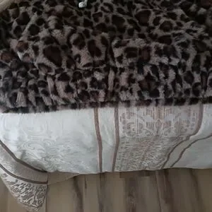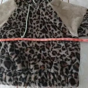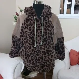 Hem & Thread stylish faux fur hoodie with a cozy feel. Features a chic design for warmth and fashion. Elastic around the bottom. Pull-on style. Side pockets. Super soft. Leopard print.