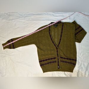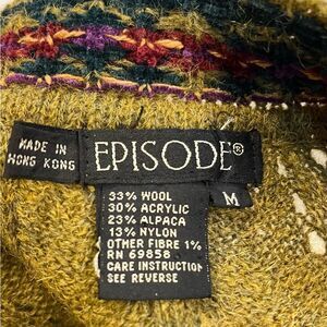 Beautiful vintage cardigan by Episode in an olive green alpaca wool blend (33% wool, 30% acrylic, 23% alpaca, 13% nylon). Features a cozy Fair Isle-inspired knit with vibrant purple and red accents, making it perfect for cottagecore, boho, or retro-inspired looks.