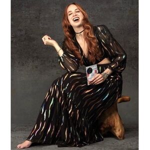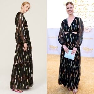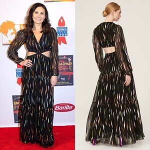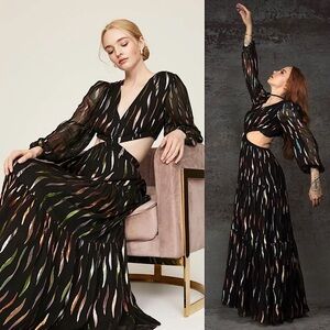 SHOSHANNA Rainbow Metallic Chiffon Puff Long Sleeve Cutout Waist Maxi Gown 10