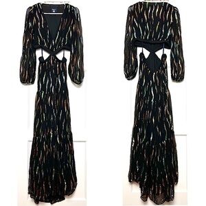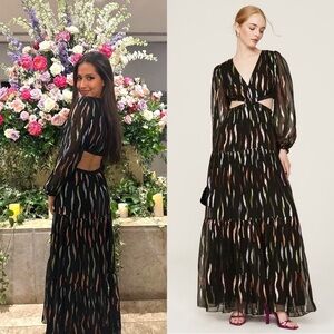 Metallic ribbons light up this whimsical maxi dress by Shoshanna Midnight featuring waist-cinching cutouts.