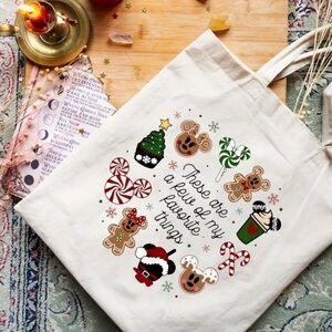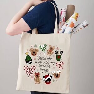 New in package, tan canvas tote bag. Inspired Christmas Mickey & Minnie Mouse gingerbreads cookies and candies- These are a Few of my Favorite Things. Dimensions of bag 16x 14 inches, strap 10 inches in length. This is super cute for the holidays.