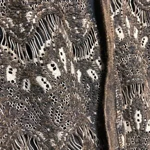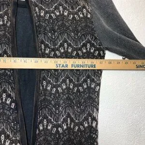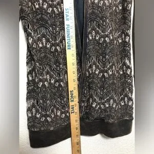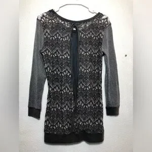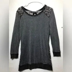 Elegant charcoal blouse with shimmering fabric. Features lace accents on shoulders. Perfect for evening wear. Good condition