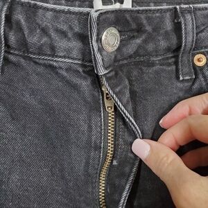 Distressed, button zipper closure, 5 pocket, raw hem jeans.