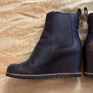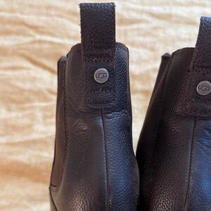 Ugg waterproof pax booties crafted of rich brown leather in good used condition, signs of use to note, scuffs, creasing as shown in pics and video.