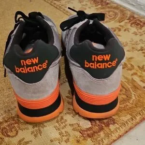 Stylish New Balance sneakers with a gray upper and vibrant orange accents. Ideal for everyday wear.