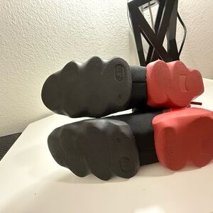 Stylish Camper sneakers with vibrant red soles. Sleek black upper for a contemporary style.