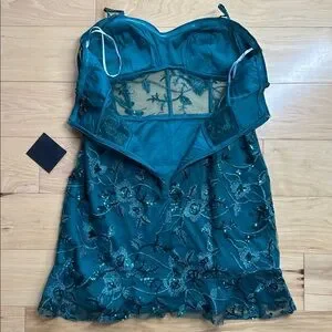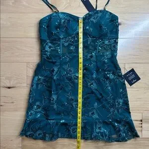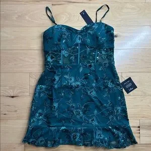 NWT Lulus Glittering Delight Emerald Mesh Sequin Embroidered Mini Dress, Size Large. Emerald green (dark green). Mesh has boning to keep the top up.