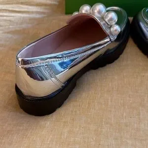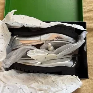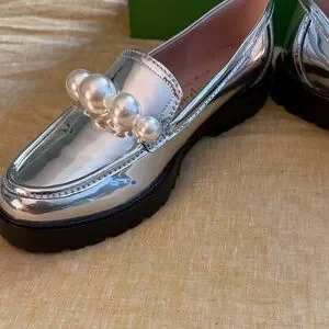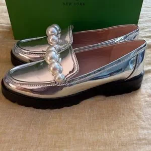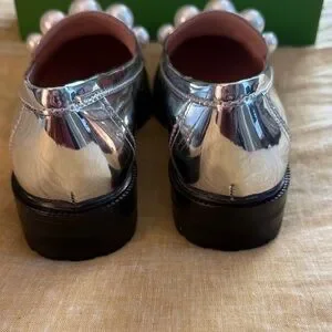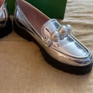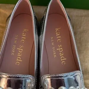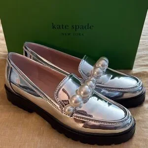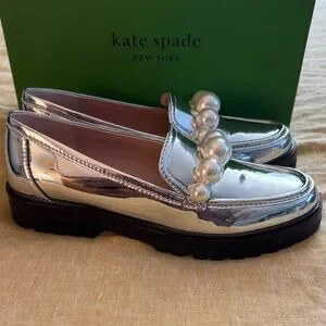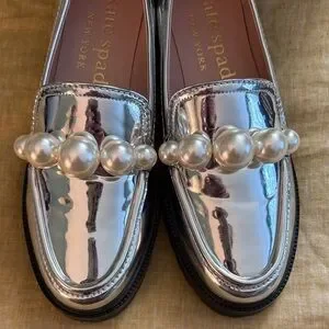 Chic metallic loafers by Kate Spade. Adorned with bold pearl accents. Perfect for elevating any look. New with tag and in box, purchased and never ended up wearing them! Please see attached video and pics to verify condition and for details!