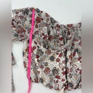 Vibrant floral blouse with ruffle sleeves. Features a tie-front detail.