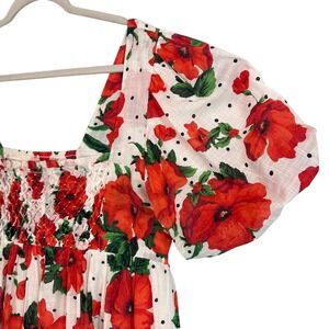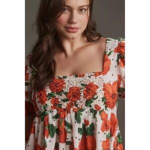 Maeve Anthropologie Red Poppy Floral Babydoll Mini Dress Puff Sleeve Large