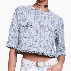 Maje tweed jacket, French designer jacket, luxury tweed blazer, structured jacket, cropped tweed jacket, Parisian style, workwear chic, classic jacket, textured tweed, designer outerwear, fall jacket, spring jacket, timeless style, size 38 jacket, new with tags